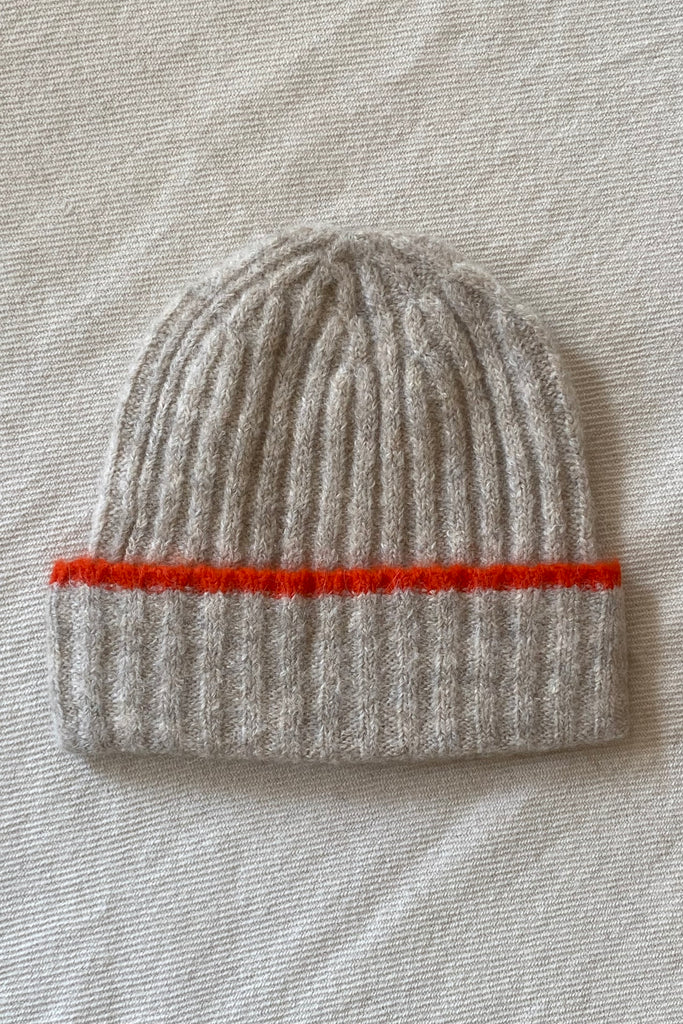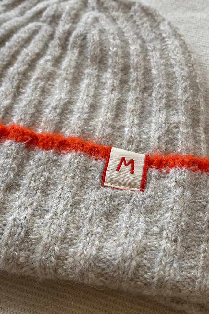 Bonnet en maille côtelé, finition orange et brodée "M "comme Moismont . Taille unique.