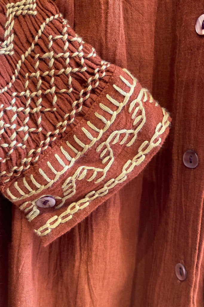 Blouse en toile, détails smockés au col et aux manches et boutonnée à l'avant et aux manches.