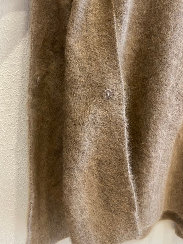 Cape en maille sans manche, coupe large, fermeture avec boutons pression sur les côtés et poches latérales.