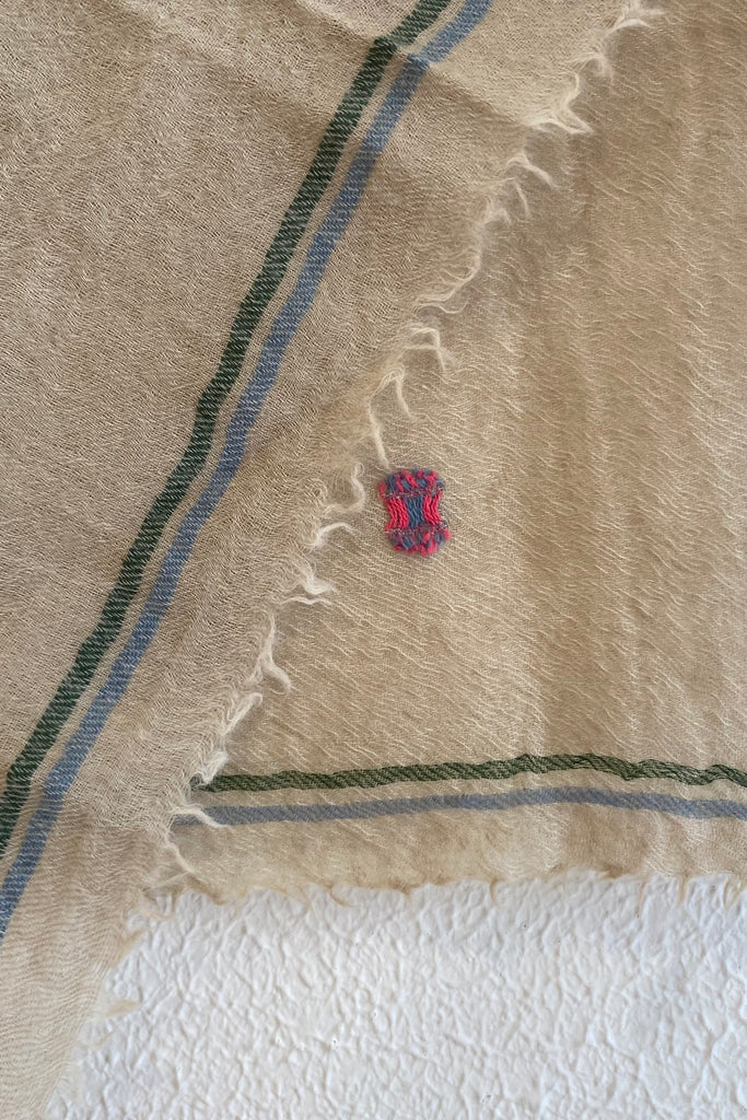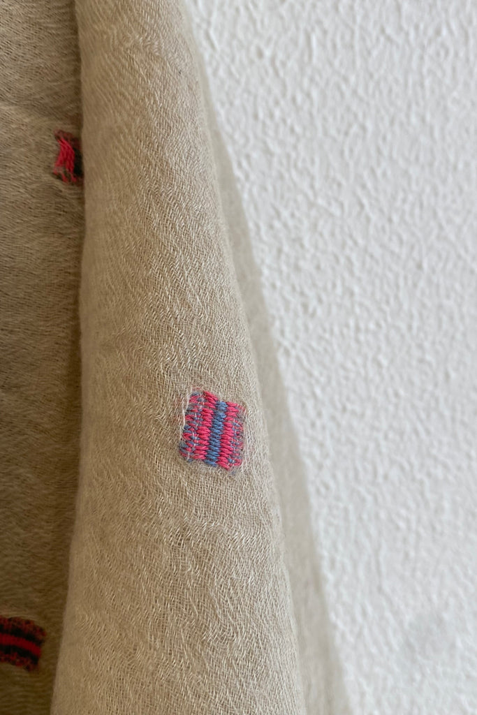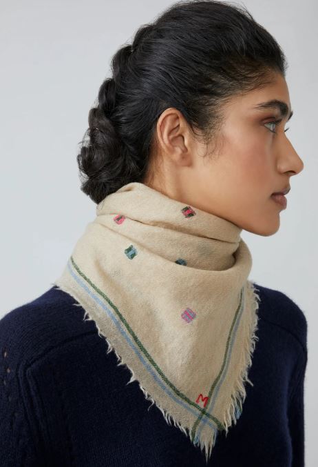 Écharpe en laine fond uni tissé et brodé, finitions frangées et broderie "M" comme Moismont.
