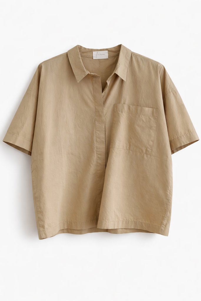 Chemisette courte en popeline, coupe carrée, patte de boutonnage cachée, manches courtes et larges et une poche poitrine. Taille unique.