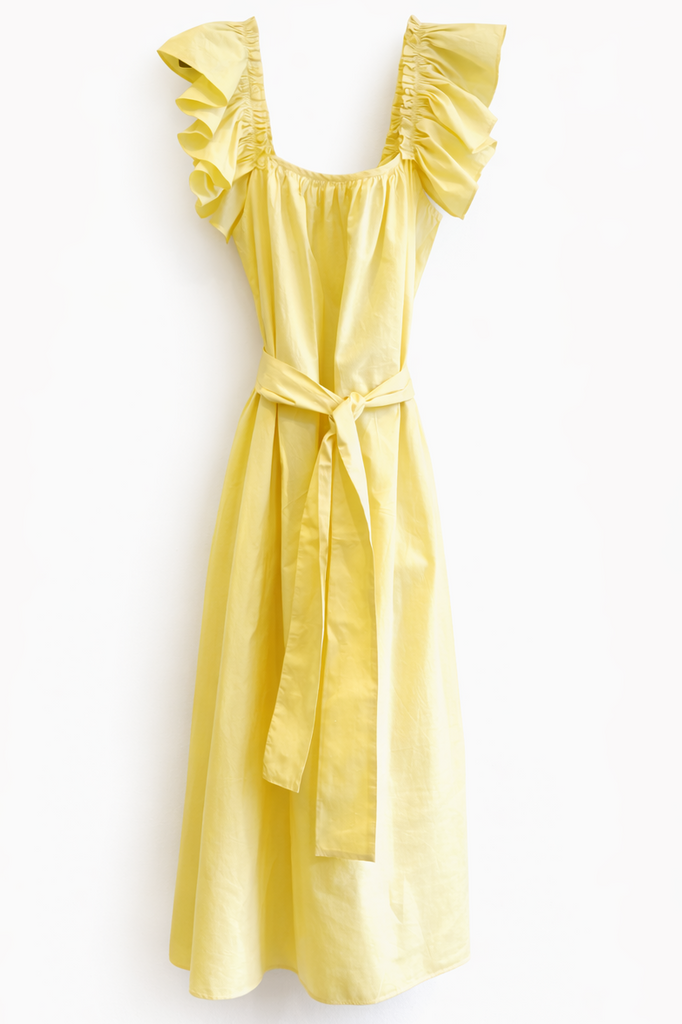 Robe en popeline de coton entièrement doublée, coupe ample, encolure carrée, brettelles volantées et élastiquées et poches sur les côtés. Vendue avec ceinture.