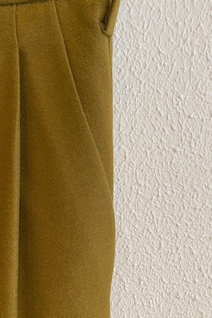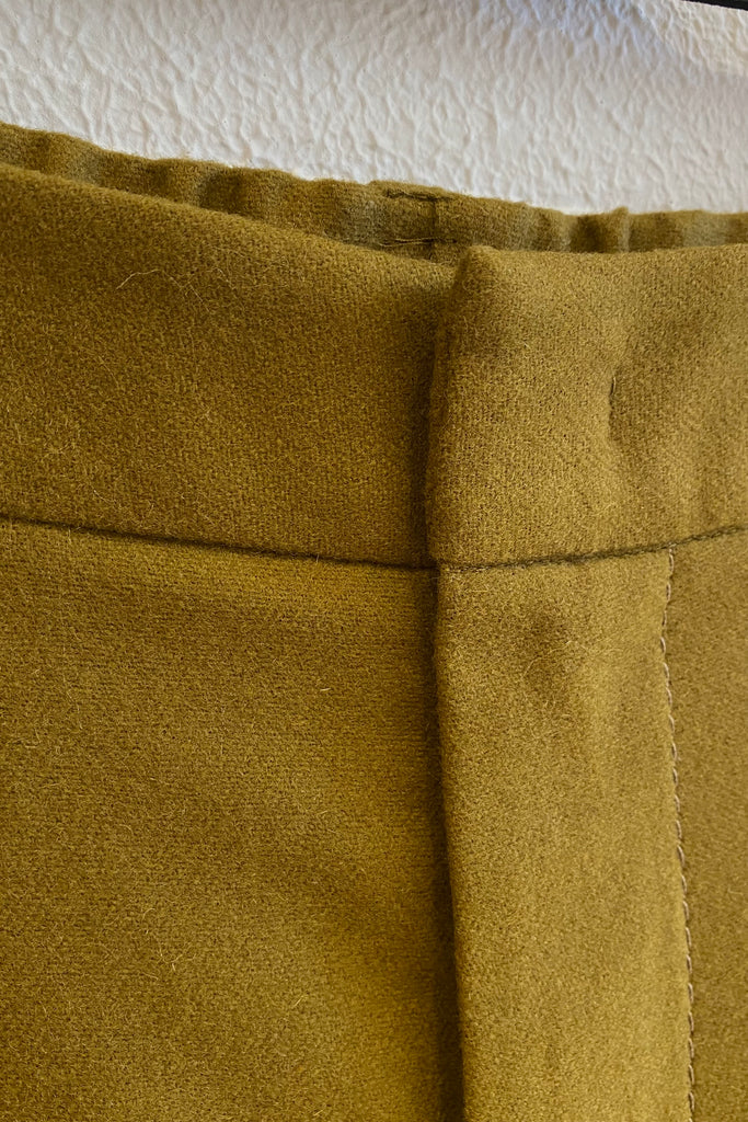 Pantalon large en lainage longueur chevilles, fermeture zip et agrafe, poches sur les côtés et deux poches passepoilées sur le dos.