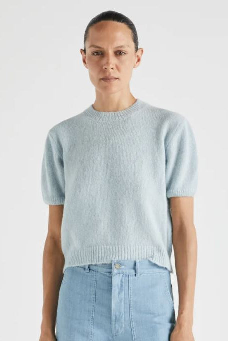 Pull en maille petit format, col rond, manches courtes et légèrement ballon. Coupe droite et longueur sous la taille.