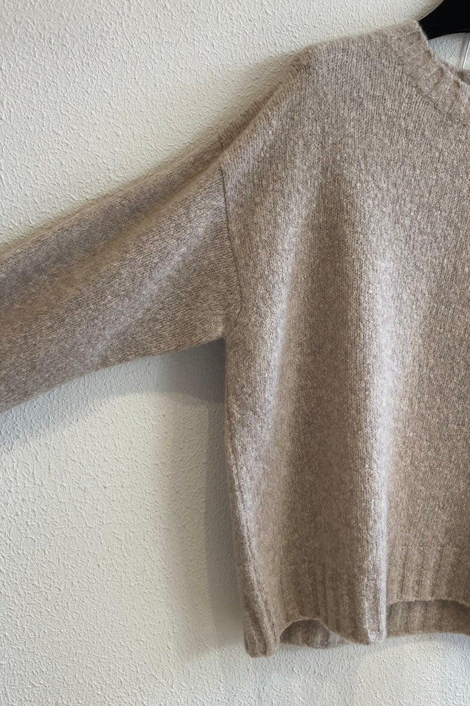 Pull en maille chinée et mousseuse, finitions côtelées, col rond et manches longues.