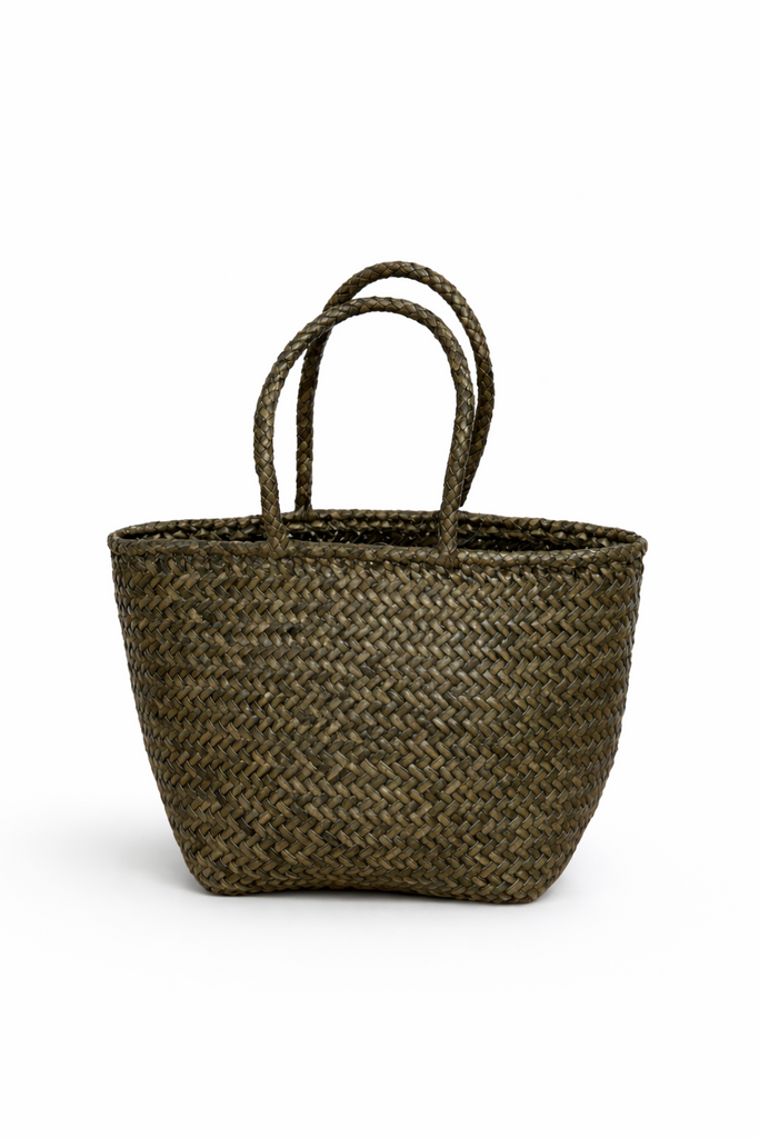Panier en cuir de veau souple tressé à la main en chevrons diagonaux, non doublé et ouvert sur le dessus.