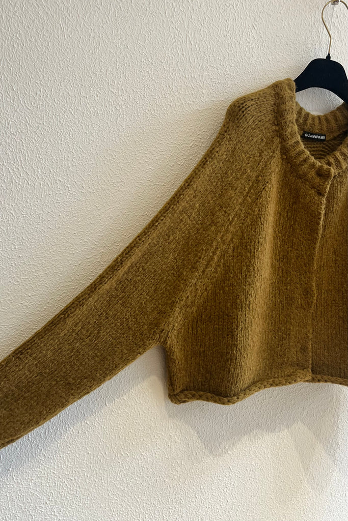 Cardigan court et épais en maille mousseuse, emmanchures raglan très basses, finition roulotée, fermeture par pressions cachées et manches longues.