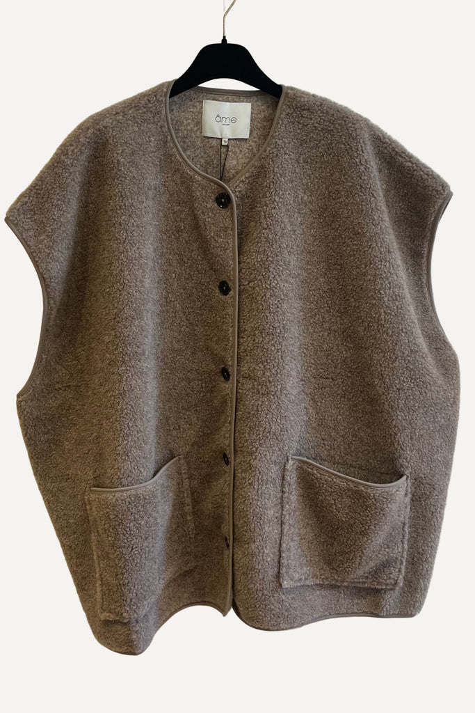 Veste oversize sans manche, souple et légère, poches plaquées et fermetures boutonnées. Taille unique
